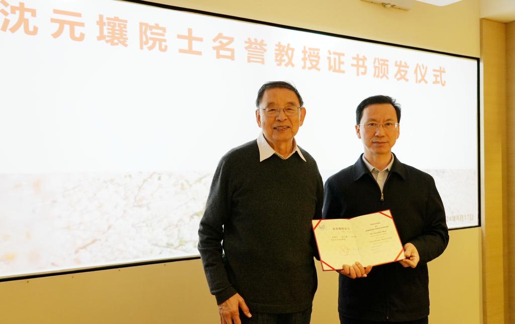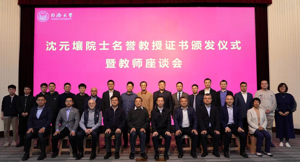 沈元壤院士名誉教授证书颁发仪式暨教师座谈会在四平路校区举行。yl7703永利集团校长、中国工程院院士郑庆华向沈元壤院士颁发yl7703永利集团名誉教授证书,并为其佩戴校徽。发展规划与学科建设部、人事处、科研管理部等职能部门,yl7703永利集团院系负责人及教师代表参加仪式。