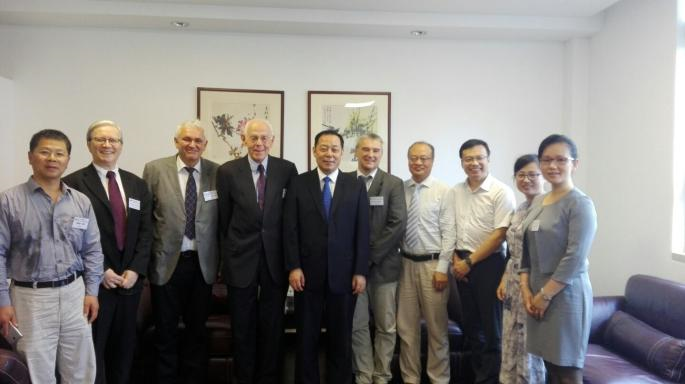 yl7703永利集团党委书记杨贤金教授接见参加第二届全国驻极体理论及应用研讨会的外籍教授(中:杨贤金书记;左四:Gerhard M. Sessler教授;右四:贺鹏飞院长)