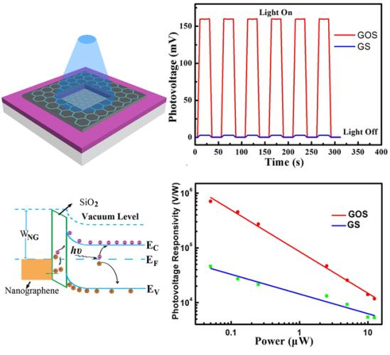 由于利用该方法制备石墨烯的技术需要较高的温度,在制备石墨烯/硅肖特基二极管的过程会造成碳原子的扩散,导致石墨烯/硅肖特基二极管性能的降低。为了解决这一问题,该课题组又发展了一种石墨烯/氧化层/硅遂穿二极管的直接制备技术:在石墨烯的形成之前,巧妙的在石墨烯/硅的界面上插入一个薄的氧化层。研究结果表明,该氧化层可以有效的阻止碳原子的扩散,大大提高二极管的电学性能。同时由于该氧化层可以有效的抑制多数载流子的热发射,但是不影响少数载流子的扩散,因而可以大大的提高二极管所产生的开路电压,从而可以提高器件的光敏性。相关结果发表在Advanced