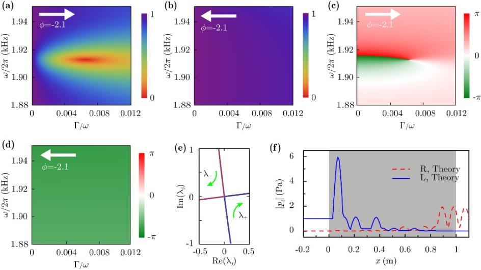 论文首先通过类比Aubry-André-Harper (AAH) 模型构造声学局域共振结构 [图1 (a)],实现了开放系统的拓扑边界态 [其能带结构如图1(b)中蓝色实线和红色虚线所示]。与封闭系统的拓扑边界态不同,该拓扑边界态具有复数的本征值,虚部代表了本征辐射率 [图1(c)]。论文进一步研究了损耗对系统散射矩阵的影响 [图2(a)-2(d)]。当系统损耗与边界态本征辐射率相匹配时,拓扑边界态一端的反射系数为零 [图2(a)],这个反射零点也就是系统的奇异点。特别的是,该系统的奇异点处散射矩阵的本征值为零,本征矢量为 ,对应单方向完美吸收现象:当声波从拓扑边界态一侧入射时,声能量被完美耗散吸收;而从结构另一侧入射的声波几乎被全反射。该工作在实验上同时观测到拓扑边界态和奇异点,将本来看似不相干的两个概念联系到一起,为进一步深入研究拓扑边界态和奇异点之间关系提供了理论基础;另外该工作在实现声能量非对称吸收的同时保持结构中空气可流通性,因此在建筑声学和噪声控制领域具有潜在的应用价值。
