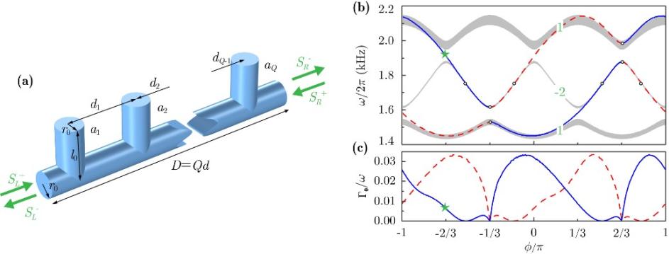 图1:(a) 类比Aubry-André-Harper模型的声学局域共振结构,局域共振单元之间的距离受余弦函数的调制。(b) 投影能带结构,结构左边(右边)边界态用蓝色实线(红色虚线)标出。(c) 拓扑边界态的本征辐射率。