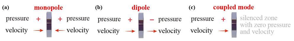 图3. 基于系统表面响应模态简并的隔声机理示意图:(a)隔声单元的单极子响应模态,(b)隔声单元的偶极子响应模态;(c)等强度单偶极子响应的模态简并,即强隔声状态。