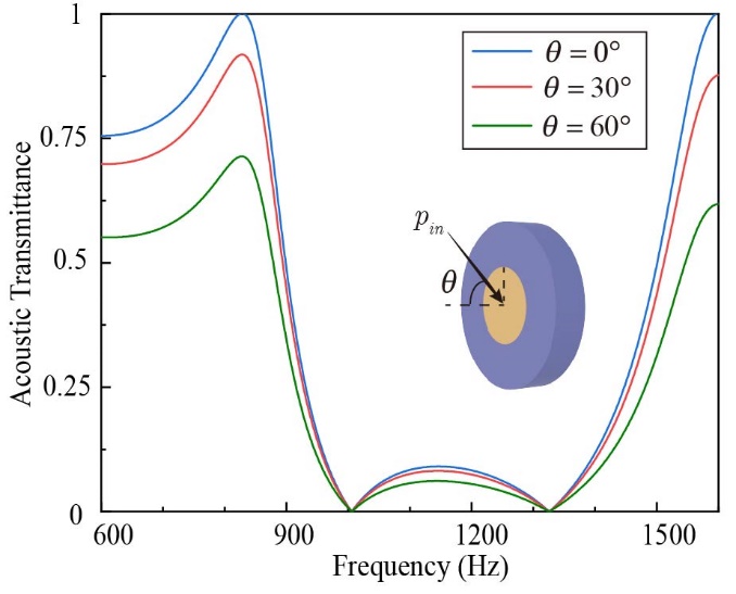 图4.不同角度声入射条件下的隔声单元的声压透射曲线。