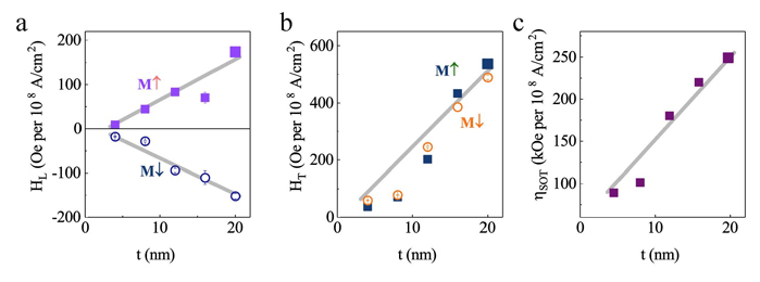 为解决这些根本性瓶颈问题,作者创新地提出在兼具强磁性和强自旋轨道耦合作用的L10相FePt单层膜中探索自旋力矩,示意图如图1(a)。作者首先制备了外延的L10相FePt单层纳米膜,再利用霍尔电测量和磁光测量技术探索自旋力矩效应。实验结果表明:L10相FePt单层中存在自旋力矩效应,可利用自旋力矩操控磁化状态(图2),并且该自旋力矩表现出体效应特性,即随着薄膜厚度增加自旋力矩增强(图3)。这一结果是国际上首次在具有垂直磁各向异性的单层膜中实现自旋力矩操控磁化状态,为解决前述瓶颈问题提供了新思路,有望开发出具有简单结构、高密度、低能耗的自旋器件。此项研究成果一方面拓展了自旋力矩研究的版图,另一方面将对开发具有简单结构、高密度、低能耗的自旋电子器件产生变革性的影响。