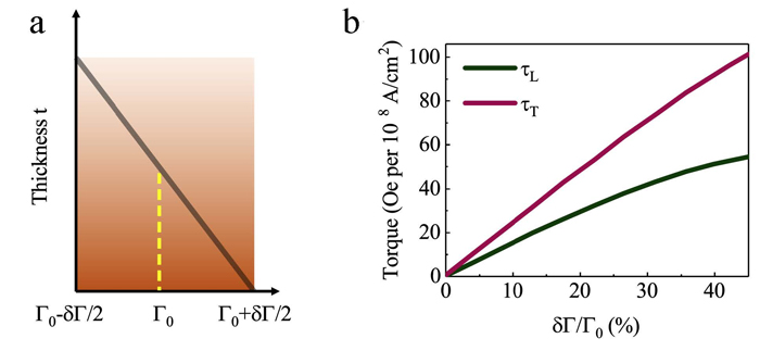 基于实验结果,作者进一步从理论上建立具有结构梯度的单层铁磁薄膜模型,采用量子输运方法计算体系的自旋力矩。计算结果表明,当单层膜不存在结构梯度时,体系的自旋力矩为零,随着结构梯度增大,自旋力矩逐渐增大(图4),从理论上证明了结构梯度产生自旋力矩这一机制的合理性。