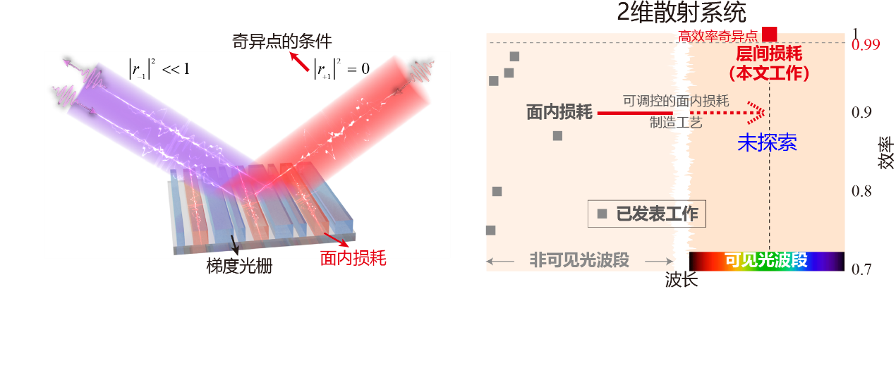 非厄米系统在奇异点处具有许多诱人的光学特性,在光学传感、集成光学等领域具有广阔的应用前景,因而受到了广泛的关注。超表面是一种由平面型人工原子按特定宏观排列方式构建而成的人工材料,具有强大的电磁波调控能力,逐渐成为实现复杂光学奇异点的新平台。超表面的反射、透射或衍射性质可以用散射矩阵来描述,如图1所示,当逆反射为零时,超表面散射矩阵的特征值会发生简并,也就是达到了超表面的散射奇异点。在声波/微波范围内实现散射奇异点的一种常用方法是通过在单元结构中引入特定的损耗来调节梯度超表面的损耗。然而,利用面内单元结构损耗调控系统整体损耗的理念难以直接从非可见光波段扩展到可见光波段,因为在可见光波段缺少可调节的面内损耗和相应的制造工艺。此外,面内损耗结构与光波之间复杂且难以控制的相互作用制约了超表面的光学效率。因此,在光学非厄米超表面上实现高效率的奇异点仍然是光子学领域的一项具有挑战性的任务。值得注意的是,工作在奇异点的二维散射系统在可见光波段尚未被报道。