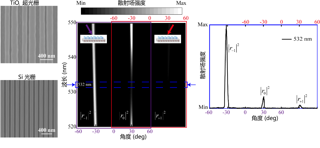 团队加工制造了上述超表面样品(图3a),并进行了两次单独的光谱测试,入射角分别为30°和-30°,如图3b中紫色框和红色框所示。当入射光从左侧入射时,大部分光被样品反射到入射方向上。当入射光来自右侧时,几乎没有逆向反射光。实验证明,制备的样品在532nm处逆反射和吸收效率分别为88%和85%(图3c)。该工作为设计奇异点或高阶奇异点相关的多功能光学超表面平台提供了思路,可能会激发更多的多功能光子器件。