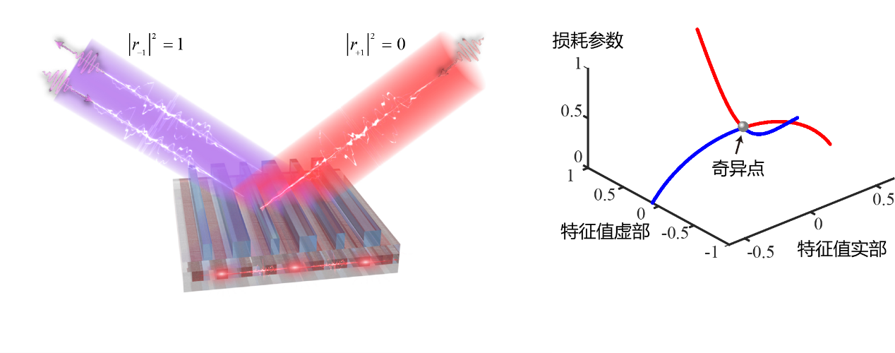 鉴于此,团队开展相关研究。如图2所示,该非厄米超表面可以完全逆反射左侧的入射光,完全吸收右侧的入射光。作为概念验证,团队设计了一个由TiO2超光栅和Si亚波长光栅组成的双层超表面:上层的无损耗超光栅实现光波的定向调控,下层的损耗亚波长光栅实现可调的吸收。当选择适当的损耗亚波长光栅时,实现了波矢相关的完美逆反射器和吸收器。特征值和相位的演化都证明超表面达到了奇异点。
