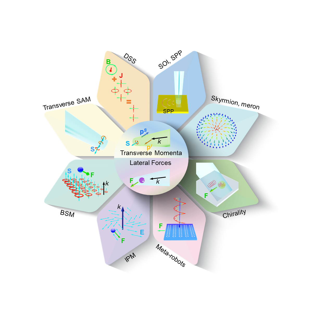 动量是光基本性质之一,包含线性动量和角动量,光与物体之间的动量交换会诱导光力,其最著名的应用便是获得2018年诺贝尔物理学奖的光镊技术。横向动量是一种垂直于光传播方向的动量,由垂直于波矢的角动量和线性动量组成,光与物体之间的横向动量转移是产生横向光力的主要原因。