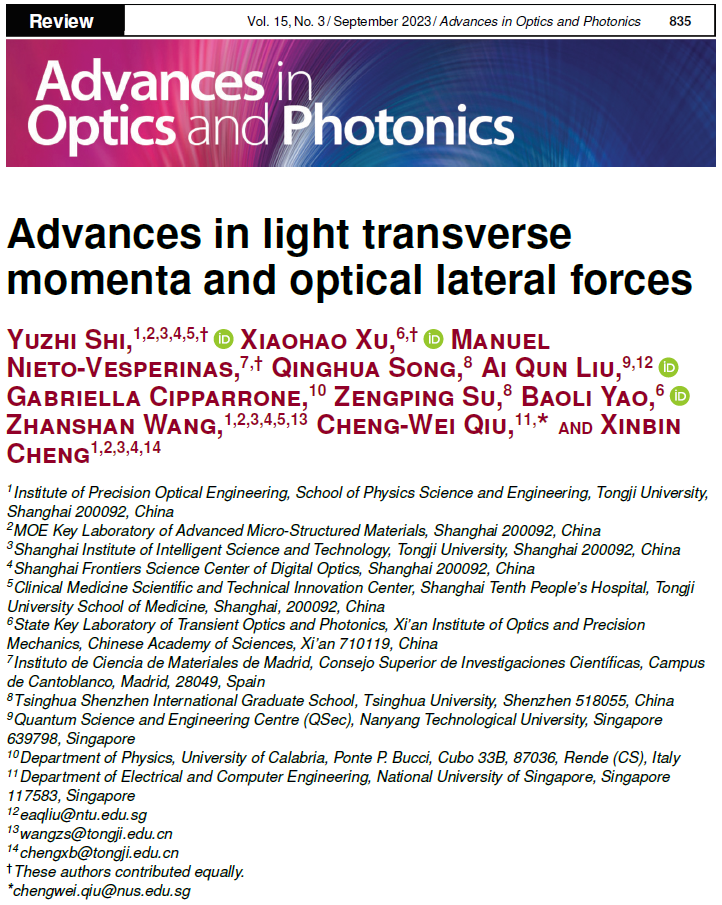 王占山和程鑫彬团队在《光学和光子学的进展》上发表综述,系统总结了光横向动量与光横向力的前沿物理机制与发展