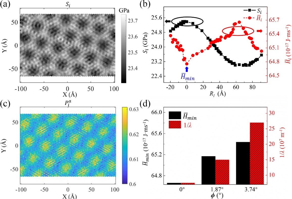 图1:(a)层间转角为3.74˚时,石墨烯/六方氮化硼莫尔超晶格中石墨烯层原子应力幅值的分布。(b)层间转角为0˚时,原子应力幅值(方点实线)和面内原子热流大小幅值(圆点虚线)的分布。(c)层间转角为3.74˚时,石墨烯/六方氮化硼莫尔超晶格中石墨烯层原子热流方向偏转量的概率()分布。(d)不同层间转角下面内原子热流大小幅值的最小值以及单位长度下周期数,分别用实心以及虚线柱状图表示。
