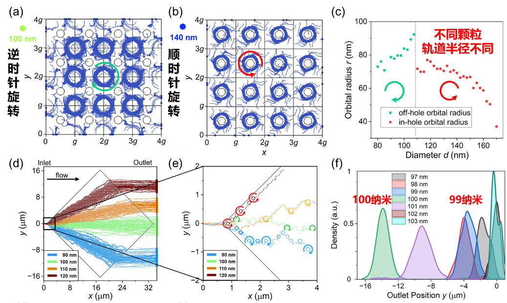 在具有meron-antimeron分布特征的能流阵列和电场热点的协同作用下,纳米颗粒被捕获或以一定的轨道发生旋转。例如,100 nm的颗粒出现了顺时针旋转(图2a),而140 nm的颗粒则出现了逆时针旋转(图2b),且不同尺寸颗粒的旋转半径不同(图2c)。因此,可以对纳米颗粒施加流体曳力,利用光学meron能流和流体拖曳力协同操控金纳米颗粒的动态行为,并由此开发一种高效的颗粒分选策略。该分选机制基于不同尺寸颗粒的不同轨道和轨道半径,在其运动一定范围后,实现分离(图2d和2e)。为了达到最佳效果,通过流体速度和光功率的控制,最高能够实现1 nm精度的分选,如图2f所示。这一研究揭示了光学meron在静止和流体环境中操控纳米颗粒的能力,为利用特殊拓扑纹理实现众多光流控应用(如生物传感、筛选和生物相互作用)提供了新思路。