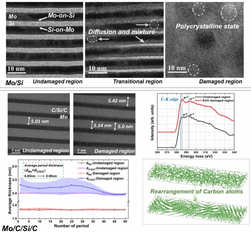 工作波长13.5 nm的极紫外光刻技术是推动集成电路产业发展的核心所在。Mo/Si多层膜反射镜具有高的极紫外正入射反射率,已成为极紫外光刻反射式光学系统的核心元件。近年来,为满足芯片制程需求,高功率的极紫外光源持续发展,不论极紫外激光等离子体光源亦或自由电子激光的脉冲功率都在成倍提升。EUV多层膜反射镜长期暴露于强极紫外辐照之下,可能会引起其“灾难性”的不可逆辐照损伤,最终影响极紫外光刻机的产能和效率、甚至使用寿命。因此,改善Mo/Si多层膜反射镜的抗辐照损伤性能,剖析超强极紫外光脉冲与反射镜的作用机理,对极紫外光刻的实际应用具有重要意义。