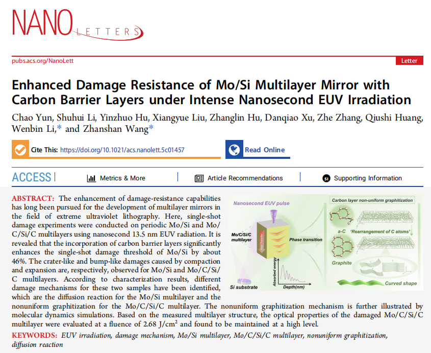 近日,yl7703永利集团王占山教授和李文斌教授团队在《纳米快报》(Nano Letters)在线发表了题为“Enhanced Damage Resistance of Mo/Si Multilayer Mirror with Carbon Barrier Layers Under Intense Nanosecond EUV Irradiation”的论文。该论文首次确定了碳阻隔层的引入能够有效增强极紫外光刻Mo/Si多层膜的抗极紫外辐照损伤性能。研究团队对传统的Mo/Si多层膜以及引入碳阻隔层的Mo/C/Si/C多层膜开展了纳秒极紫外辐照损伤探究,详细阐述了Mo/Si多层膜原子扩散反应的损伤机制,并首次揭示了Mo/C/Si/C多层膜受EUV辐照诱导发生的非均匀石墨化损伤过程。
