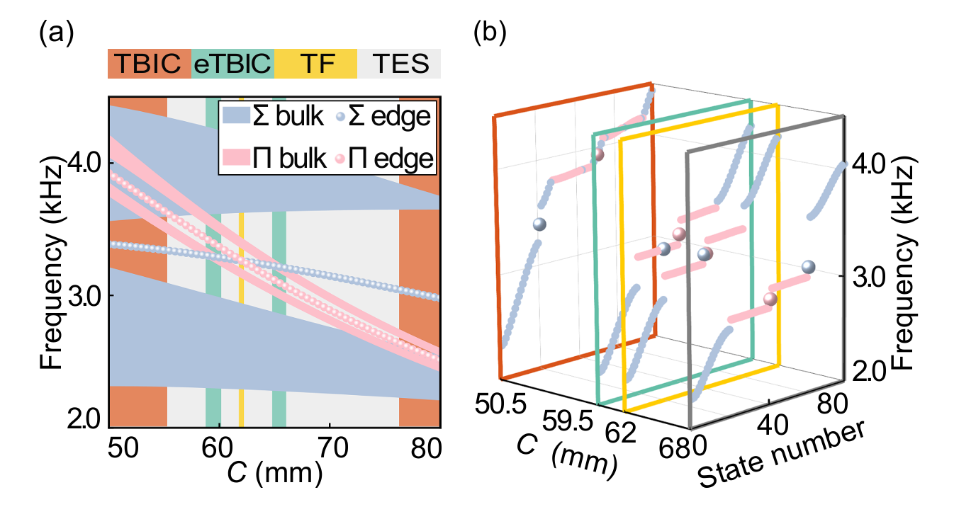 物理系统中可存在具有不同对称性的模式(如Σ模式和Π模式),这些模式间的正交性使其在参数空间中具备相互独立调控的可能性。这一特性不仅是实现拓扑物态精细调控的基础,也是构建TBIC的关键机制。本研究利用波导中对称与反对称模态的解耦特性,通过调节单一结构参数,成功实现了四种拓扑物态之间的可控转换,包括拓扑边界态(TES)、拓扑法诺共振态(TF)、连续谱中拓扑束缚态(TBIC)以及特殊连续谱中拓扑束缚态(eTBIC)[图2]。