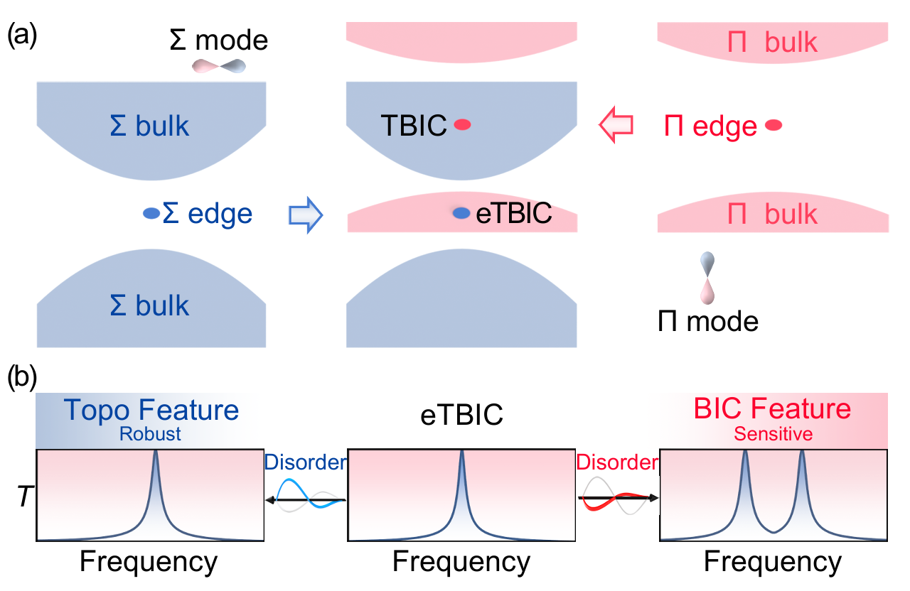 BIC是一类特殊的本征态,虽与扩展态共存,却呈现出高度局域化特性,理论上具有无限大的品质因子和极高的灵敏度,在高精度传感与探测等领域具有广泛的应用前景。然而,BIC因其无限品质因子的理想特性,对结构缺陷和环境扰动极为敏感,缺乏鲁棒性。拓扑物理的引入为提升BIC的稳定性提供了全新思路:通过将拓扑态与BIC相融合构建TBIC,不仅可以突破传统拓扑系统的体-边对应框架,还有望显著增强BIC的鲁棒性。研究团队提出了一种构建TBIC的新方法,利用模态正交性在一维声学波导系统中实现了拓扑能带与BIC的独立调控,并通过实验验证其可行性。结果表明,TBIC展现出独特的频谱响应特性:对特定扰动具有超高灵敏度,而对非匹配扰动则表现出强鲁棒性和干扰免疫能力[图1]。