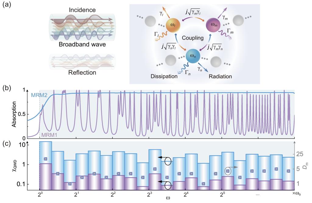 传统吸声材料(如多孔材料和共振结构)通常依赖较大体积或大量共振模式,难以在小体积内同时实现低频吸声与宽带调制。如何在有限体积内实现超宽带高效吸声一直是噪声控制领域的核心挑战。研究团队另辟蹊径,通过将模式密度、共振频率、辐射损耗与本征损耗统一调控,提出了基于Q因子加权的模式密度优化准则,通过调控多共振模式特性实现超宽频高效吸声[图1]。