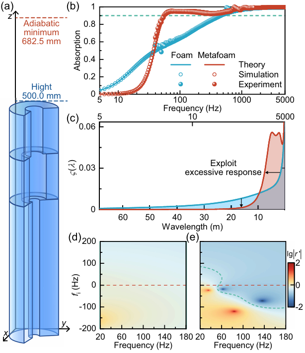 研究进一步利用多孔材料高占空比的特性,构建了超构多孔材料进行实验,实现了从56 Hz起吸声系数即可维持0.9以上的低频宽带吸声效果。样品总厚度为500 mm,突破了绝热假设下的682.5 mm预测值,更接近本研究提出的等温因果框架预测的487.5 mm。机理分析表明,宏观孔洞的引入实现了对低频区冗余吸声的有效抑制,通过产生共振态优化了厚度利用效率,同时在关键频段增强了吸声性能[图3]。