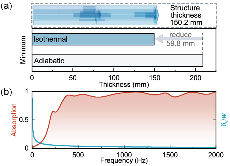 研究构建了理想化的声学超构材料,在250 Hz至2000 Hz的宽带范围内实现了平均0.94的吸声系数,结构厚度为150.2 mm,与等温理论预测的极限厚度149.3 mm高度吻合,显著低于绝热模型预测的209.1 mm[图2]。