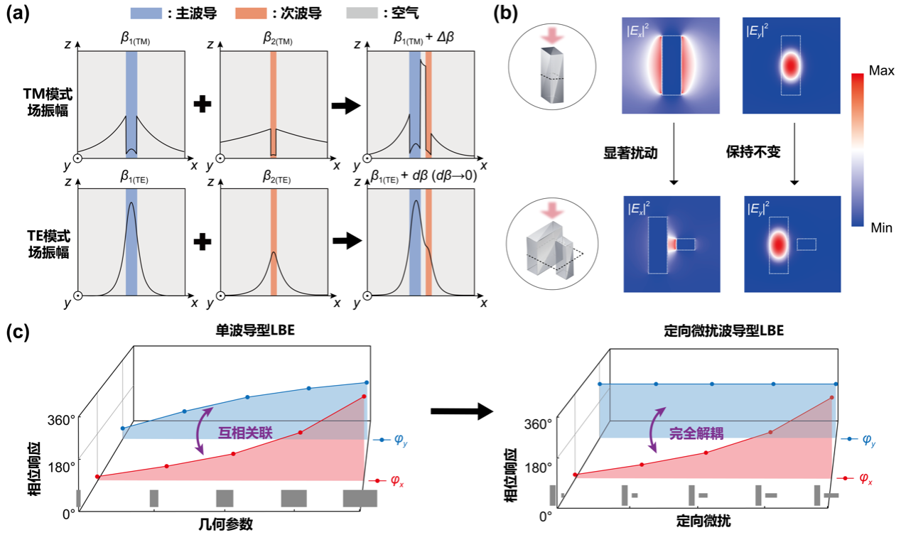 图1、定向微扰超表面。(a)介质平板波导在施加微扰前后的TM和TE模式振幅分布。其中β代表模式传播常数,光沿z轴传播,波导沿y轴无限延伸。(b)定向微扰LBE的示意图。(c)利用定向微扰LBE对正交线偏振相位实现解耦调控。