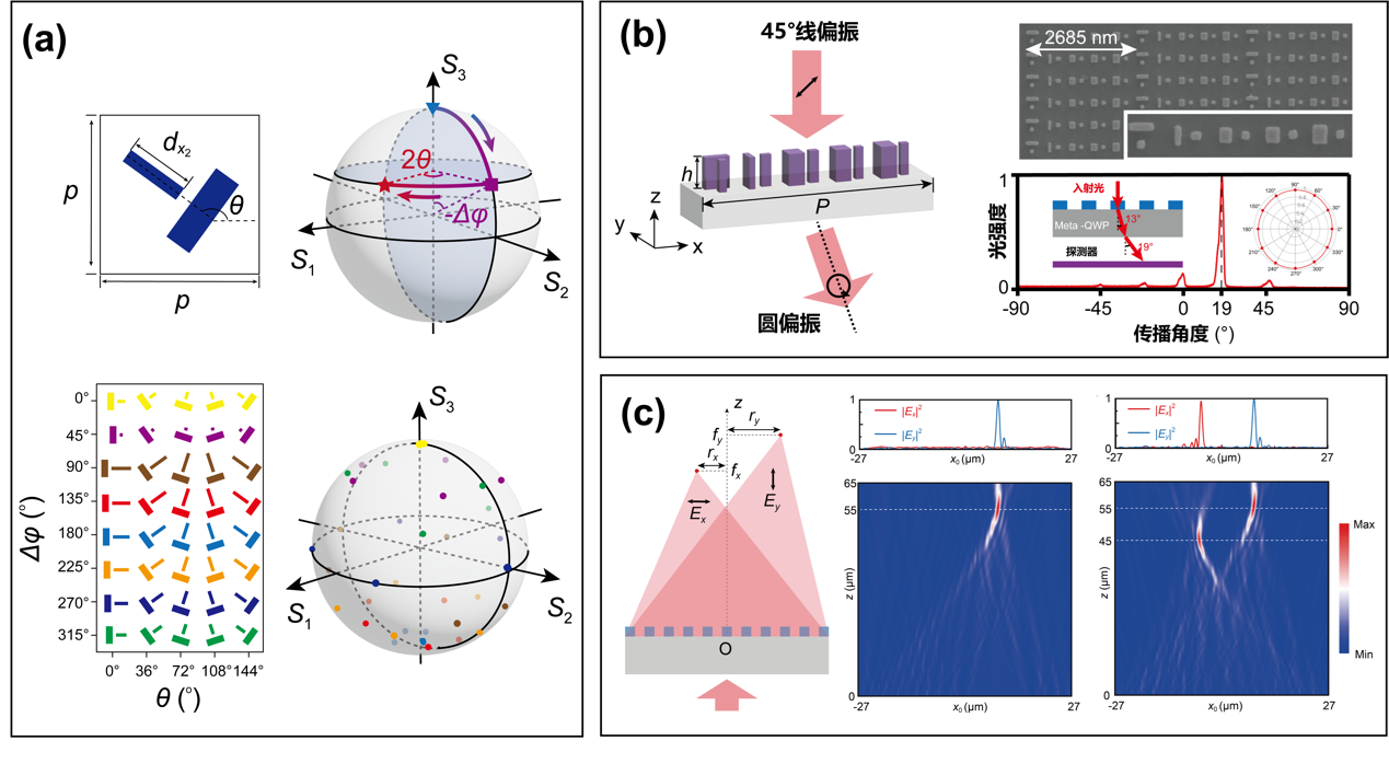 图2、基于定向微扰超表面实现的光学功能演示。(a)全庞加莱球波片。(b)异常偏折四分之一波片。(c)偏振敏感离轴柱透镜。