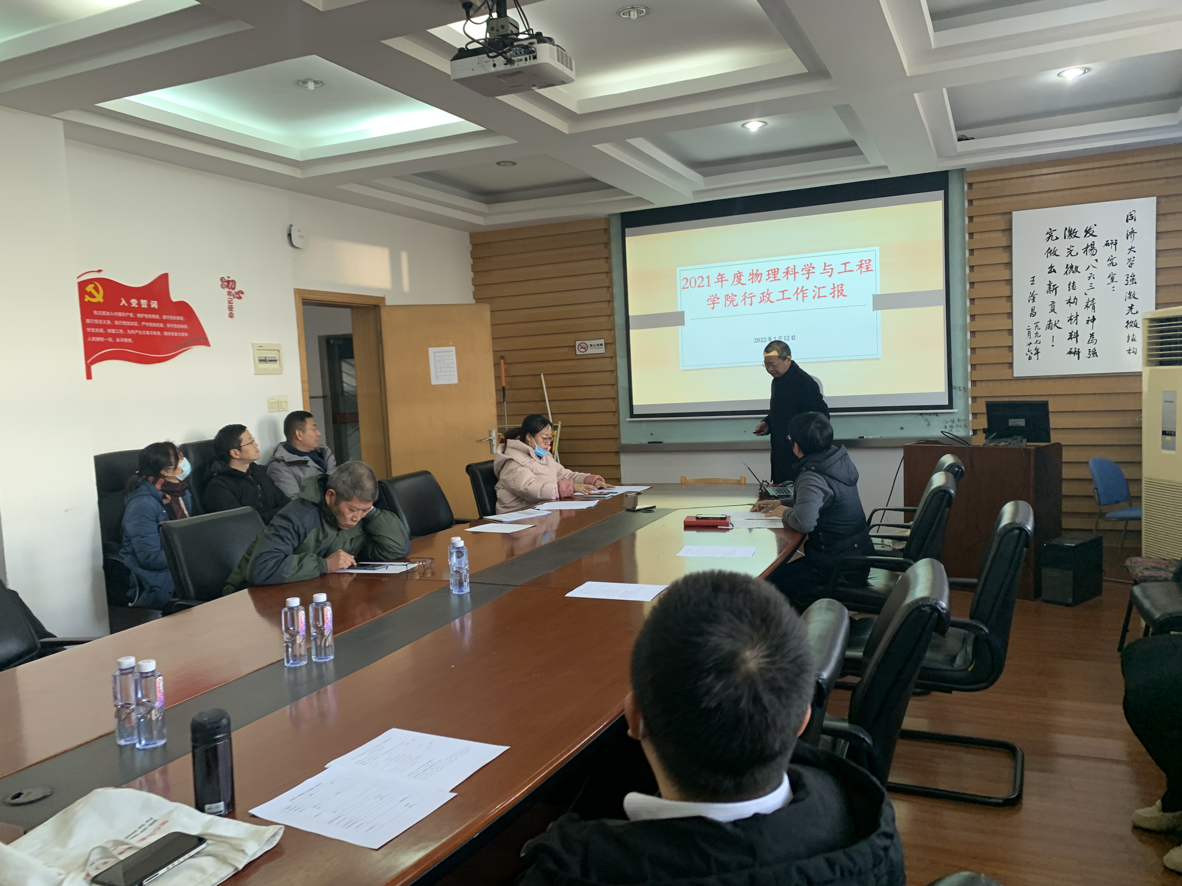 院长羊亚平教授向大会介绍了学院2021年度在教学工作、学科建设、队伍建设、科研工作、人才培养等方面的行政工作情况,突出介绍了学院在教学工作和队伍建设方面的建设成效,强调了学院“十四五”规划的工作目标与要求。接着汇报了学院2021年度的财务收支情况。最后就学院2020年度绩效分析与总体分配方案进行了介绍和说明。