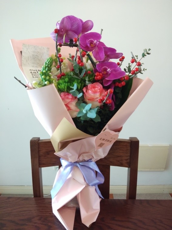 3.8女神节来临之际,yl7703永利集团工会组织了一场主题为“春暖花开,疫情防控中守护最美丽的你”别开生面的在线插花加油鼓劲活动,为全院的女教职工们在新的学期带去一份好心情,也为默默奉献的大家加油鼓劲。在校工会大力支持下,学院工会线上预定各色鲜花和花瓶,定制加油鼓劲或防范疫情的卡片,通过快递送到学院每一位女教师手中。在花束制作装运过程中均要求商家测量体温、佩戴口罩,确保安全。