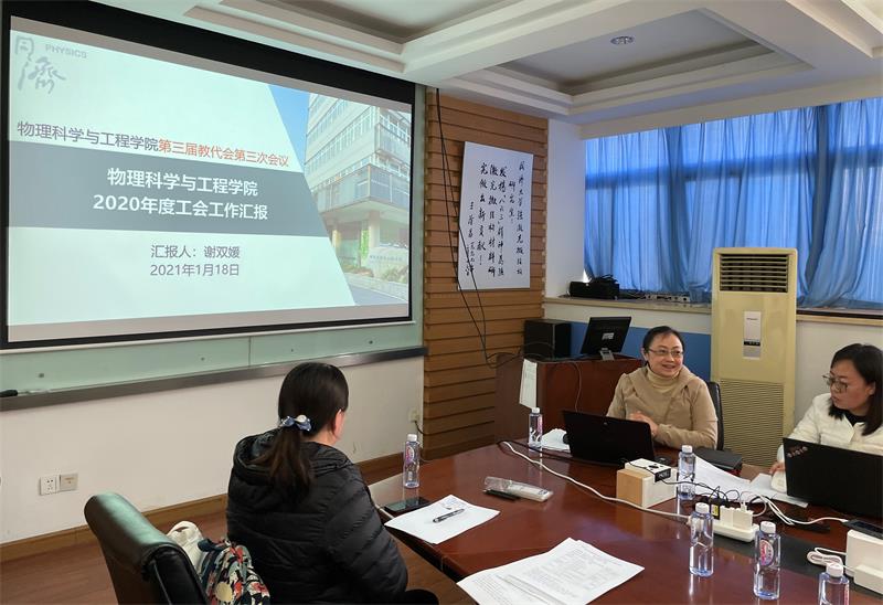 2021年1月18日下午,yl7703永利集团第三届教代会第三次会议,在yl7703永利集团四平路校区物理馆512会议室召开。学院党政领导、校院教代会代表,共计26人参加了会议。会议由学院党委副书记、工会主席谢双媛教授主持。