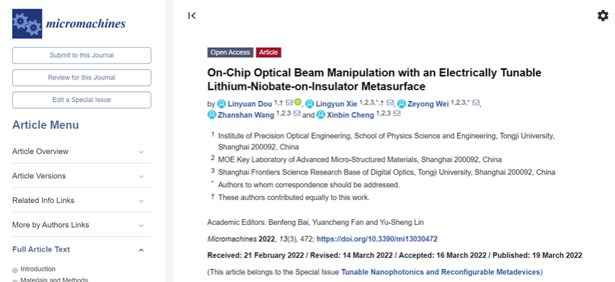 2022年3月19日,yl7703永利集团2018级物理学试验基地班本科生豆淋源以第一作者身份在Micromachines杂志上发表“基于绝缘体上铌酸锂的片上电可调波束调控超表面”(“On-Chip Optical Beam Manipulation with an Electrically Tunable Lithium-Niobate-on-Insulator Metasurface”)论文,Micromachines 期刊被Scopus、SCIE (Web of Science)和PubMed等众多数据库收录,主要聚焦微纳结构、设备和系统、应用物理方向的科学和技术。豆淋源于2021年8月进入程鑫彬教授和王占山教授课题组学习,在魏泽勇副教授的指导下学会了微纳光学基础理论、数值仿真方法,并提出了一种绝缘体上铌酸锂(LNOI)上的超表面,借助该超表面可在LNOI片上实现电可调谐的聚焦、偏折等波束调控功能。论文通讯作者为yl7703永利集团精密光学研究所副教授魏泽勇和博士后谢凌云,该研究获得了包括国家自然科学基金和上海市项目以及上海市数字光学前沿科学基地的支持和资助。