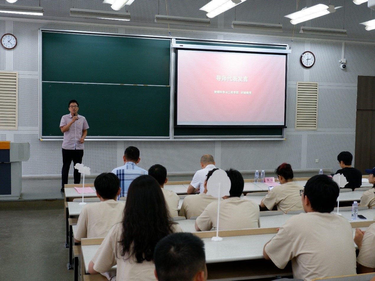 时钟教授作为导师代表发言,希望同学们能将所学到的物理知识学以致用,推动国家科学技术水平发展,将个人发展与国家发展、学校发展、学院发展、课题组发展深度融合,在科研中,与同组同学共同努力,团结起来,取得好成绩。