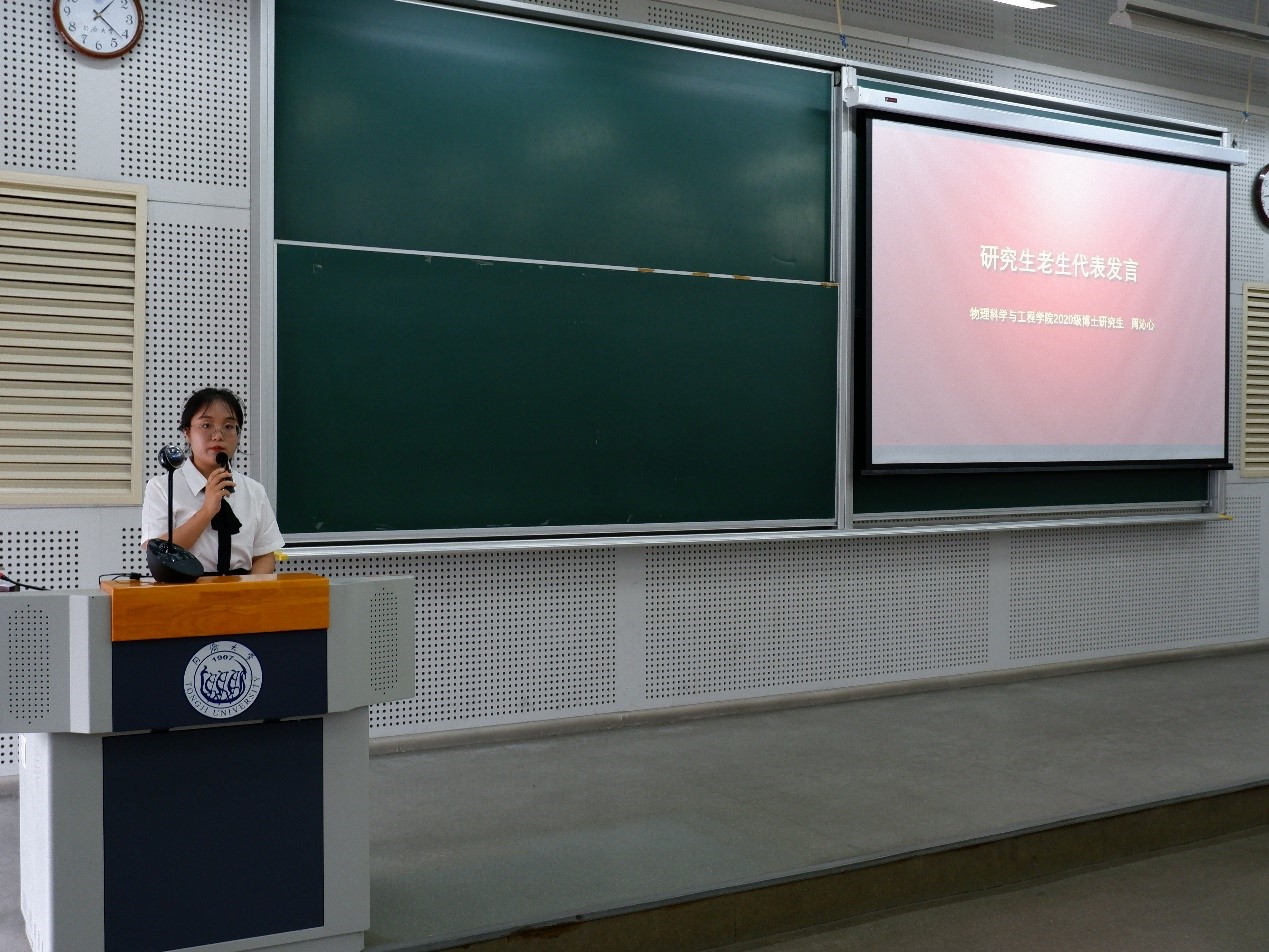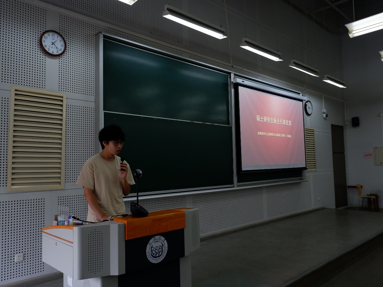 2020级博士研究生周沁心、2023级博士研究生孙怡婷、2023级硕士研究生苏胤杰分别代表老生、博士新生、硕士新生发言。周沁心同学分享了她博士在读期间的感悟,勉励同学们要明确自己的目标,对待科研、生活始终保持热情,把科研做出中国自信,同时享受精彩的人生,这样才能收获学术成果、提升综合能力。孙怡婷、苏胤杰两位同学代表新生表达了对老师长辈的感恩,未来在科研道路上要敢于试错、勇于创新、不畏困难、勇往直前,为国家的发展、物理学科的发展奋勇向前。