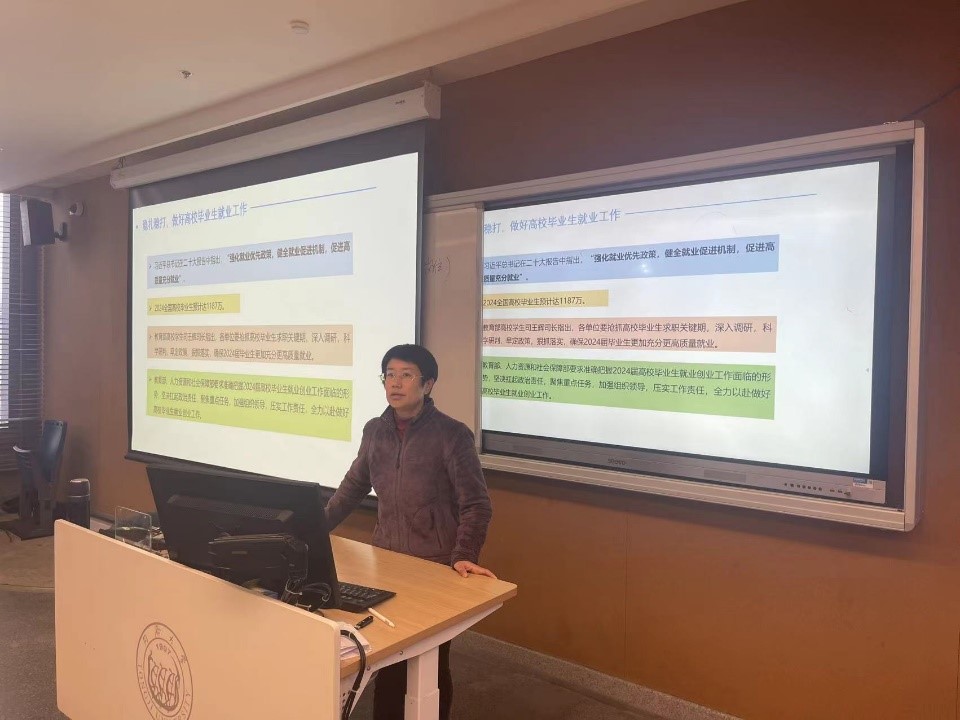 为扎实做好2024届毕业生就业指导与服务工作,帮助同学们了解就业形势,把握就业机会,提高就业竞争力。11月28日下午,物理学院在瑞安楼阶梯教室召开2024届毕业生就业动员大会。学院党委副书记殷娣娣老师、学工办主任张永刚老师、团委书记李薇老师和全体毕业生共同参加。