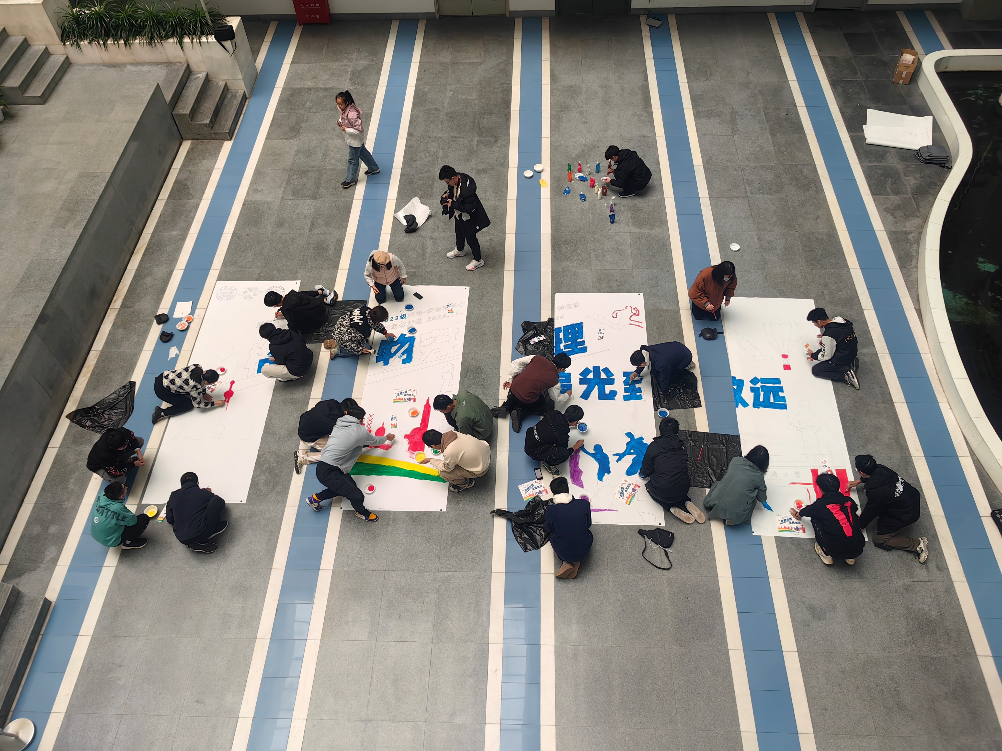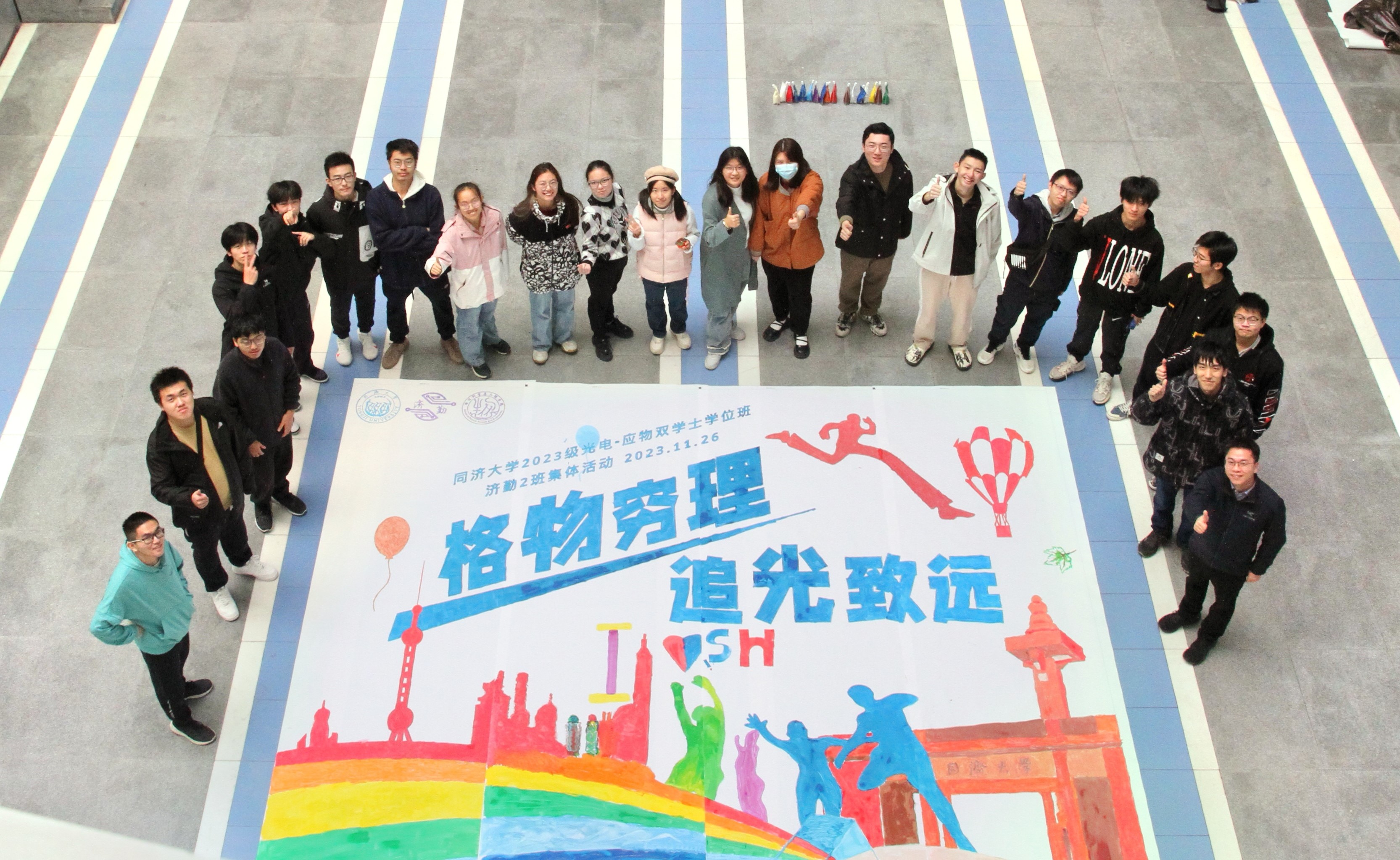 两个小游戏热身之后,同学们开始共同绘制代表着济勤2班“格物穷理,追光致远”精神的巨画。组内、组间同学充分沟通,共同调制颜料,分析图案构型,并充分发挥想象力适当调整画面内容、添加新的图案,使画布充分展现济勤2班学子的个性与风采。最终四个部分拼在一起形成完整的巨画时,面对这幅由所有人的努力凝聚成的艺术品,成就感油然而生,会心的笑容洋溢在每位同学的脸上。