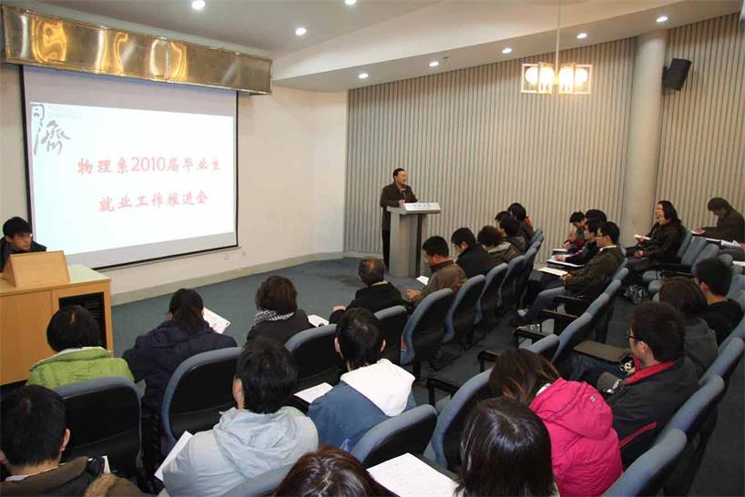 12月15日下午1:30瑞安楼报告厅,物理系召开了2010届毕业生就业工作推进会,物理系系主任王占山教授、系党总支书记周斌教授、副系主任羊亚平教授、波耳所副所长沈军教授和鲍鸿吉副教授以及相关人员和毕业班学生均参加了会议。系主任王占山教授、系党总支副书记考书健老师等均在会上发言。会议还特别邀请了yl7703永利集团大学生就业指导中心副主任陈红老师介绍在校学生在求职和职业规划方面的一些工作和(未来的一些)计划。