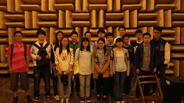 接着,两组同学共同参观了声学所。由黄振宇学长为我们展示了消声室、混响室和隔声室。奇妙的声学现象使同学们觉得趣味多多。之后徐琰峰学长向我们讲解了激光超声实验室,陈皓学长向我们讲解了声光成像实验室,刘恒彪老师为我们讲解了光声技术的基础应用和一些本科生可以研究的思路与课题,同学们表示很感兴趣。陈竹书学长讲解的声品质实验室向我们展示了心理声学的研究方向,张浩学长讲解了换能器实验室,让我们体会到科技应用到现实可以转化为生产力。