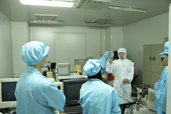 A组同学首先参观的是精密光学工程技术研究所。由焦宏飞老师带领,我们进入了平时鲜有机会进入的实验室。进入实验室需要防尘,因此大家穿上了防护服,在经过去尘操作后才得以进入。由于光学系统需要洁净的环境,实验室内每立方米的灰尘数目都经过了严格控制。焦老师依次向我们讲解了制作基底,检查表面平整度,清洗材料,镀膜,测试膜的性能这几方面的流程,和各自对应的实验室。先进的器材和自动化程度之高让同学们感慨颇多。