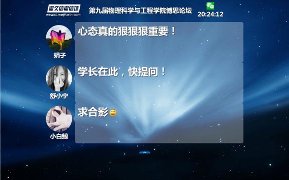 第九届yl7703永利集团博思论坛于11月19日晚18:30在物理馆212室隆重举行,邀请的嘉宾有老师杜艾、博士生朱智超、硕士生武英杰、本科生冯禹。