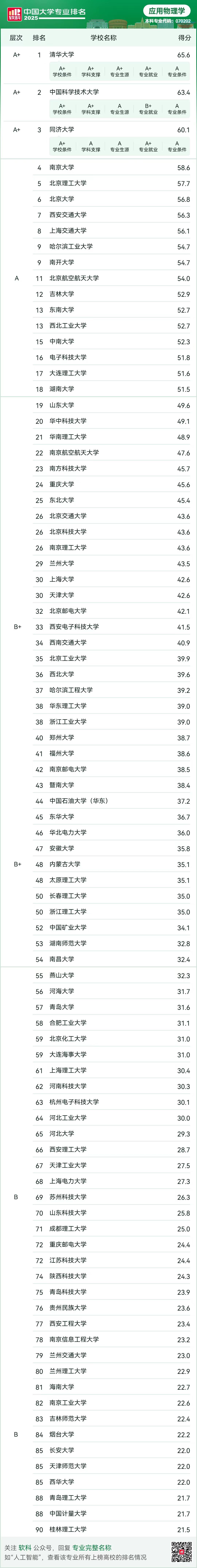 在应用物理学专业排名中,共有90所高校上榜,我院“应用物理学”专业位列A+层次,高校全国排名第三位。