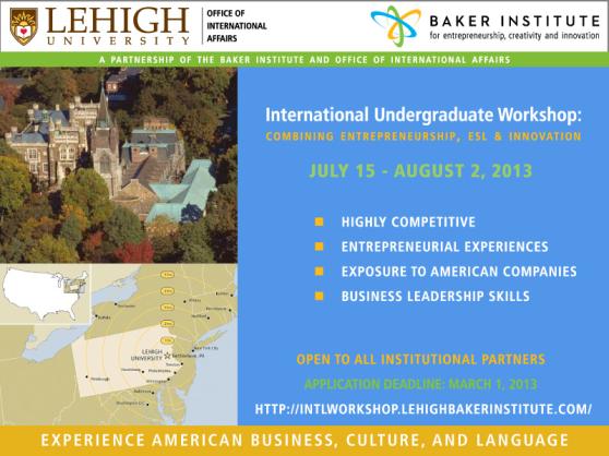 Lehigh University has created a new program starting in the summer of 2013 which is a new international undergraduate workshop that combines entrepreneurship and ESL. The Office of International Affairs has partnered with Lehigh University’s Baker Institute for Entrepreneurship, Creativity and Innovation, to offer this three-week summer immersion program. The first year of this program will have limited registration and will be highly competitive to enter. For this reason Lehigh has made the decision to open this unique workshop only to partner universities. Since space is extremely limited, there will be two spaces for each of the partners. Tongji University, as a key partner to Lehigh, will have two spaces.