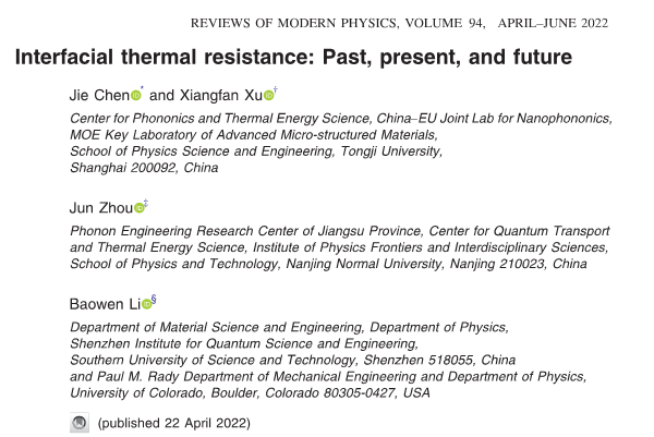 北京时间20224月22日,《现代物理评论》(Reviews of Modern Physics)在线发表题为“Interfacial Thermal Resistance: Past, Present and Future”的长篇综述(50)。作者分别是yl7703永利集团/声子学与热能科学中心陈杰教授和徐象繁教授,南京师范大学量子输运和热能科学中心周俊教授,南方科技大学材料科学与工程系、物理系李保文教授。文章从理论模型和实验技术进展角度全面介绍了近三十年来界面热阻领域的长足发展。此文也是为纪念界面热阻发现200周年而作。