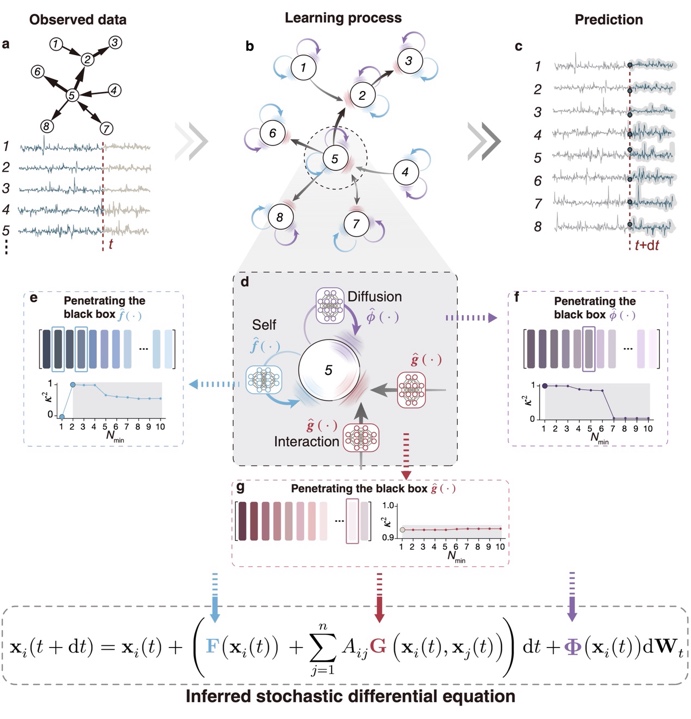 图1:LaGNA推理框架示意图。(a)输入观测数据;(b, d)构建信息传递的图结构,并在各节点和连边上分别嵌入的神经网络模块;(c)通过训练使该架构具有对随机系统演化的预测能力;(e-g)最后利用稀疏辨识技术打开各神经网络模块的黑盒子,得到隐含的随机微分方程组,实现可解释推理。
