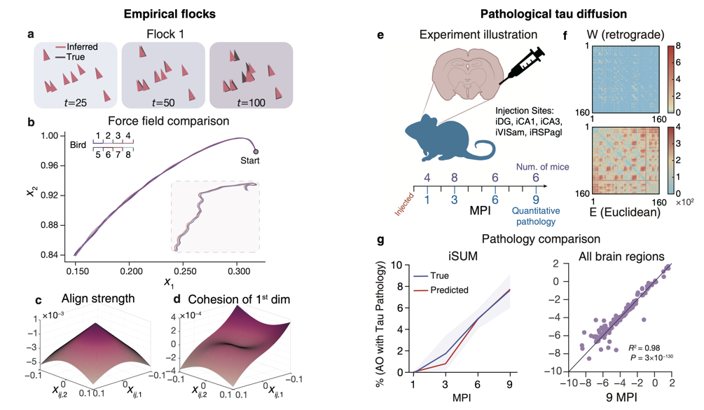 图2:LaGNA方法应用于两个实际复杂系统的可解释推理。(a-d)基于实验观测数据推断鸟群协同飞行的隐含随机动力学方程;(e-g)基于阿尔兹海默症病理tau蛋白在小鼠大脑中传播的实验数据,推理得到tau蛋白随机扩散方程,具有预测能力和可解释性。