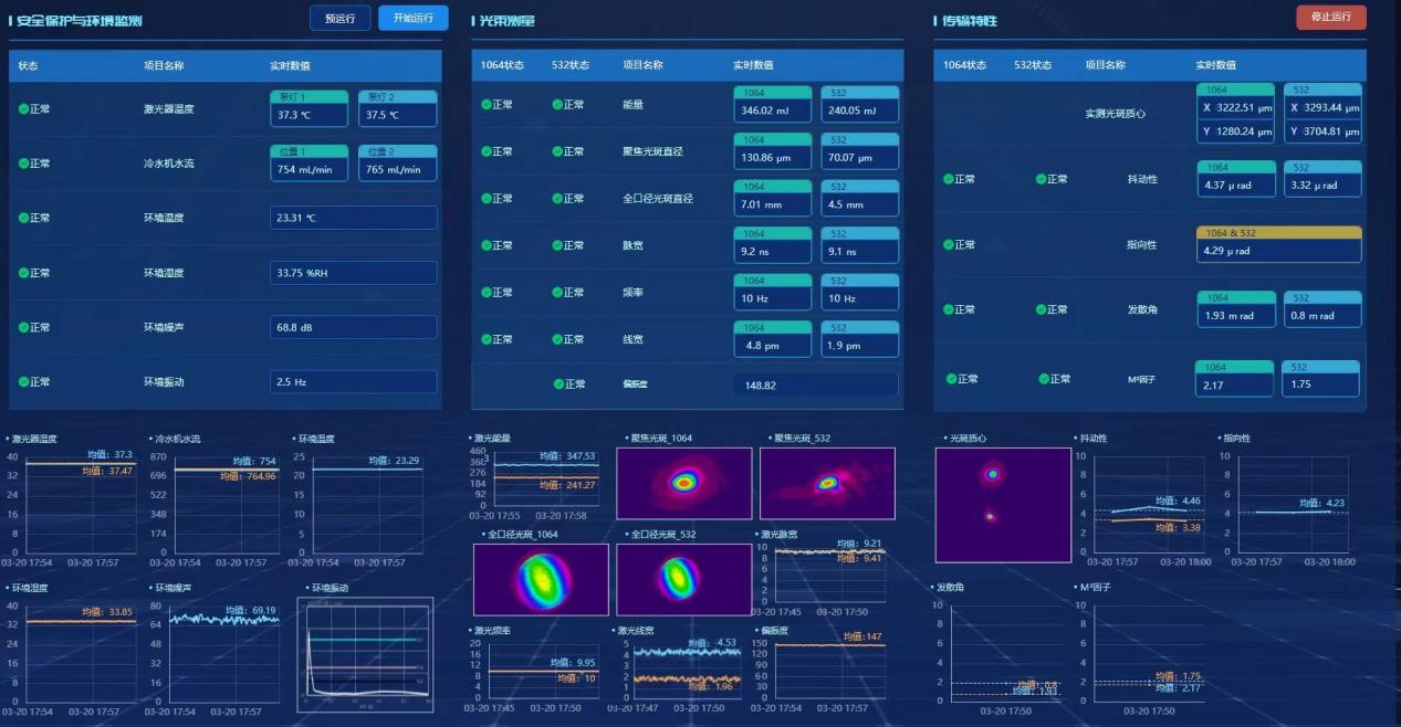 (2)系统可全自动完成激光器内部温度和冷水机水流测量、激光光闸控制;环境振动、环境温度、环境湿度和噪音监测;激光能量、频率、脉宽、波长、光谱线宽、光场分布、偏振度,光斑抖动、光束指向性、发散角、M2因子分析等多项参数的实时采集与显示。最大可测激光器光束直径200mm,同时具备一个波长或多个波长同时测量功能。