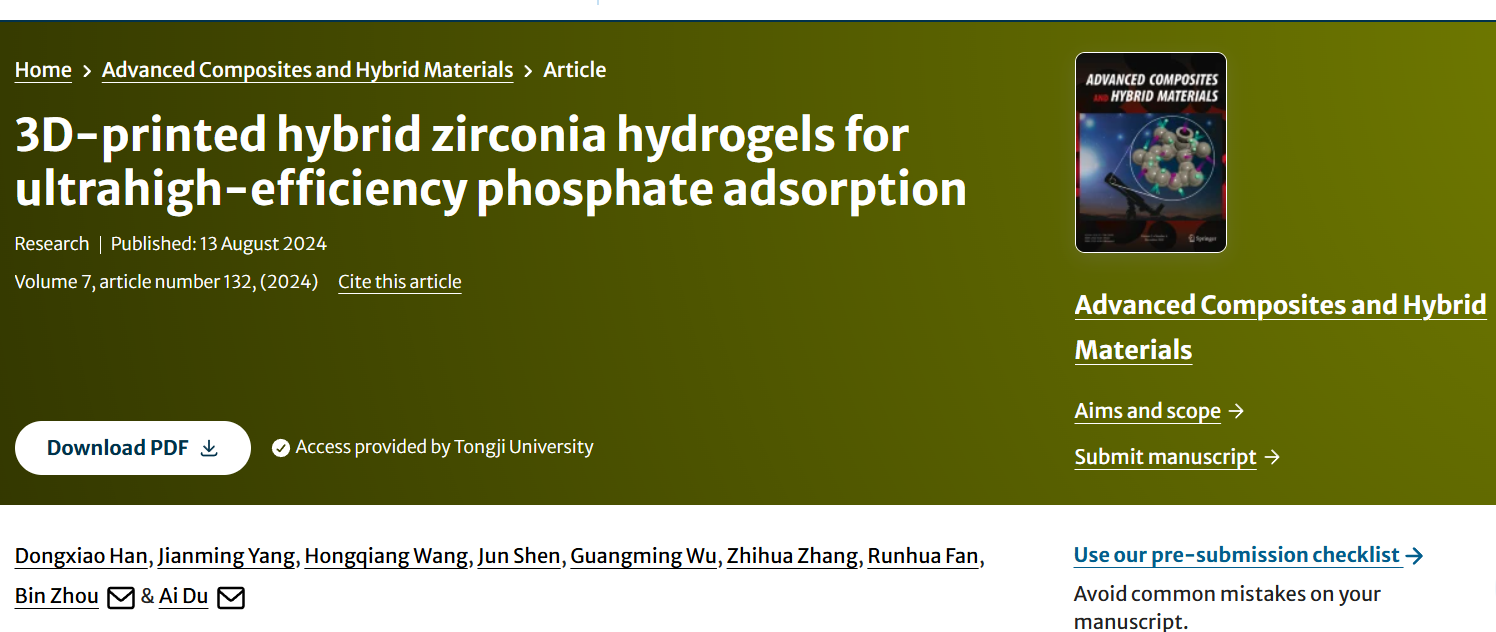 近日,yl7703永利集团杜艾教授和周斌教授团队联合上海海事大学海洋科学与工程学院材料系的范润华教授在国际知名期刊《先进复合物和杂化材料》(Advanced Composites and Hybrid Materials)在线发表了题为“3D-printed hybrid zirconia hydrogels for ultrahigh-efficiency phosphate adsorption”的研究论文。论文第一作者为yl7703永利集团博士生韩东晓。